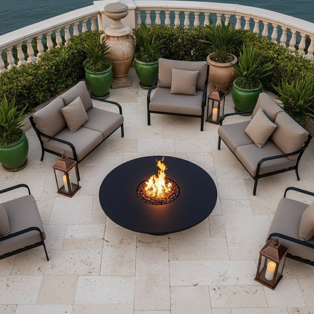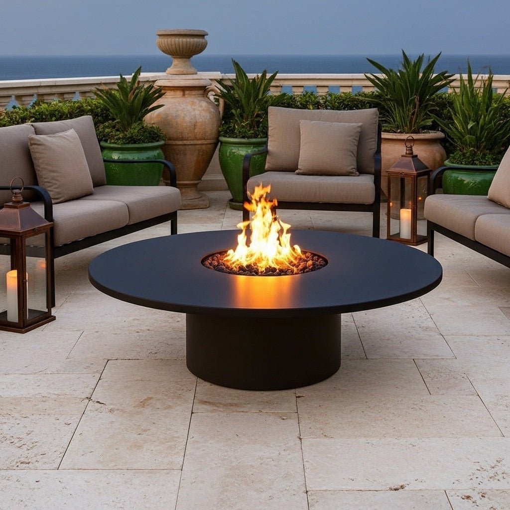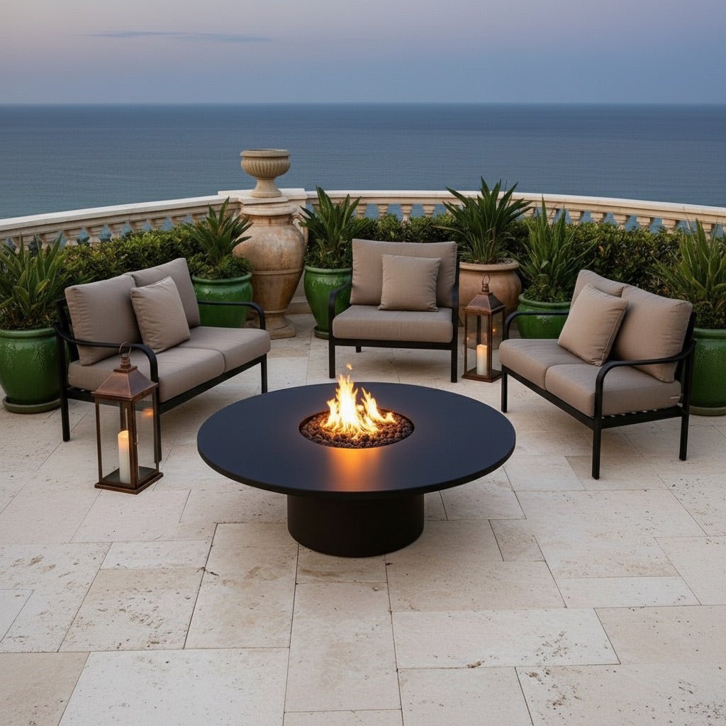The Circa Fire Pit Coffee Table features a sleek, circular design with a thinner tabletop profile that adds a refined, modern touch. Built from marine-grade aluminum alloy, it offers lasting durability and clean aesthetics. Designed for both indoor and outdoor settings, it delivers reliable performance while serving as an understated yet striking focal point.