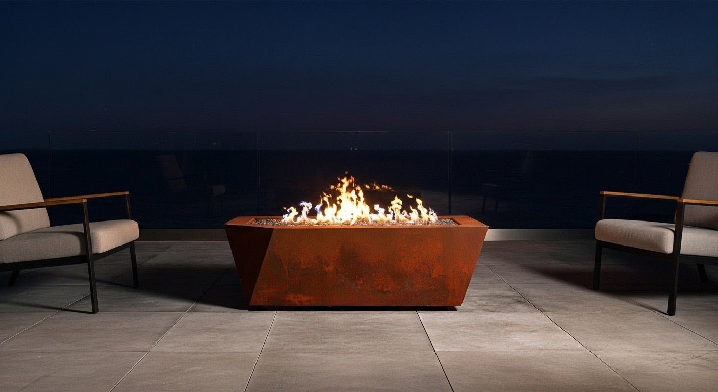 At 76"L x 32"W x 24"H, the Chip Fire Pit Table adds architectural sophistication and warmth to any outdoor environment. Contact us to customize yours.
