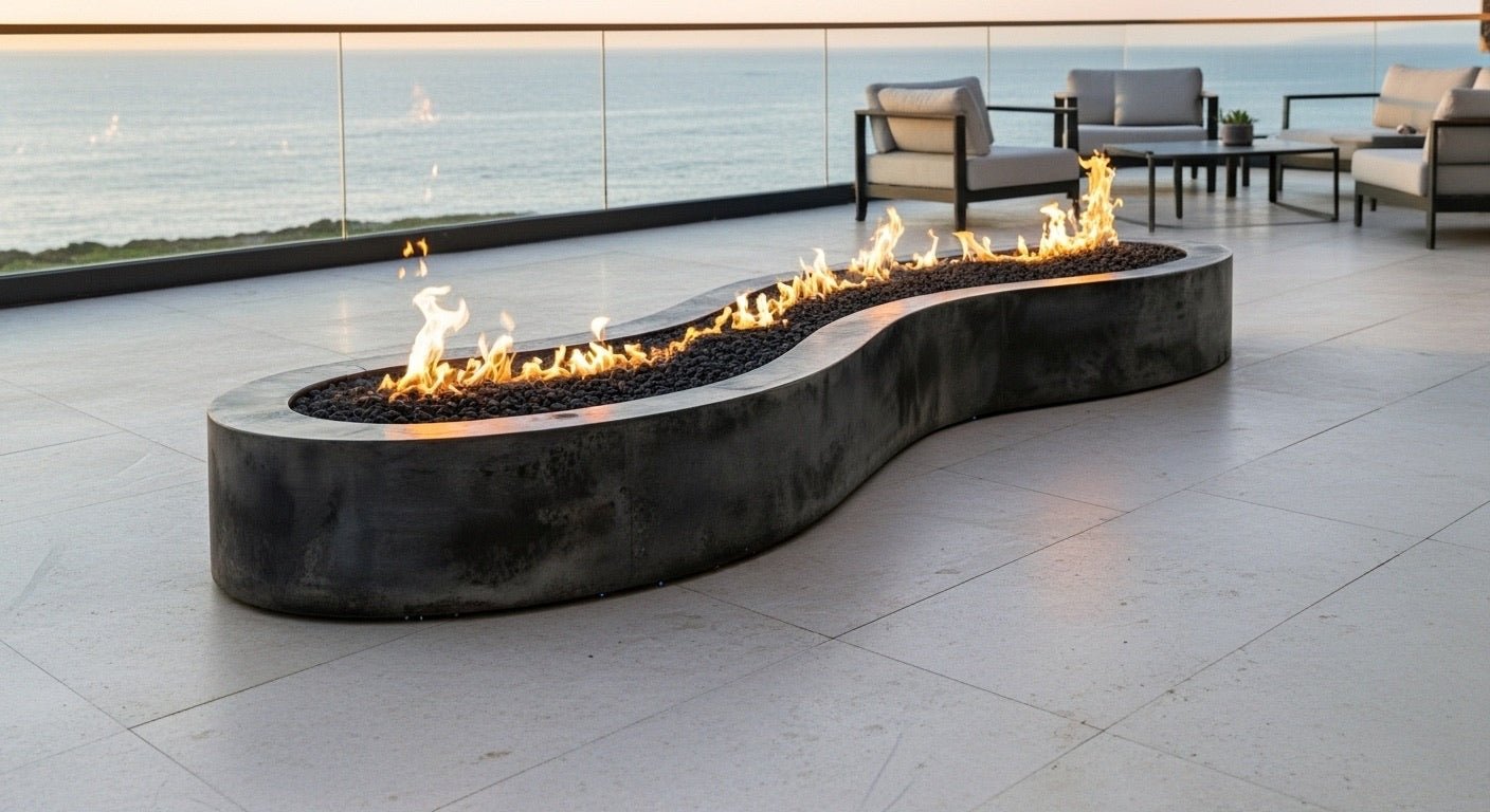 At approximately 119"L x 39"W x 14"H, the Flows Fire Pit Table blends organic form with modern elegance. Contact us to customize yours.