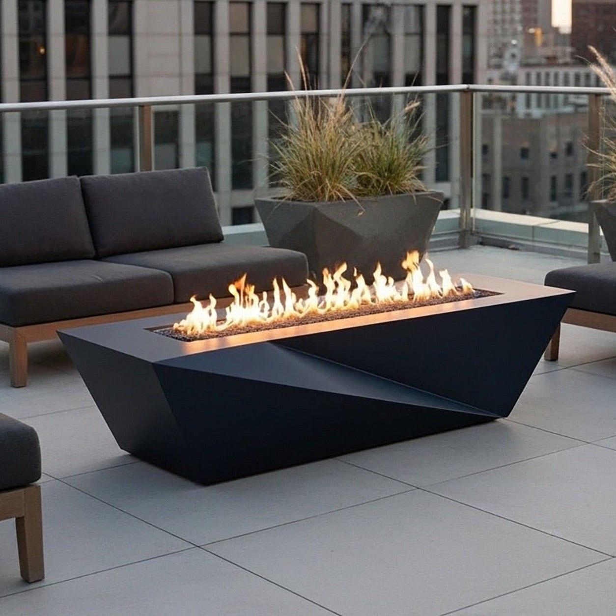 The GeoSlope Fire Pit Table is a sculptural expression of geometry in motion, defined by its distinctive sloping sidewalls and clean architectural lines. The angled planes create a sense of flow and precision at the same time, giving the table a dynamic profile that feels intentional from every viewpoint. Its form evokes shifting landscapes and modern landforms, making GeoSlope a refined yet bold centerpiece that naturally draws attention without excess.