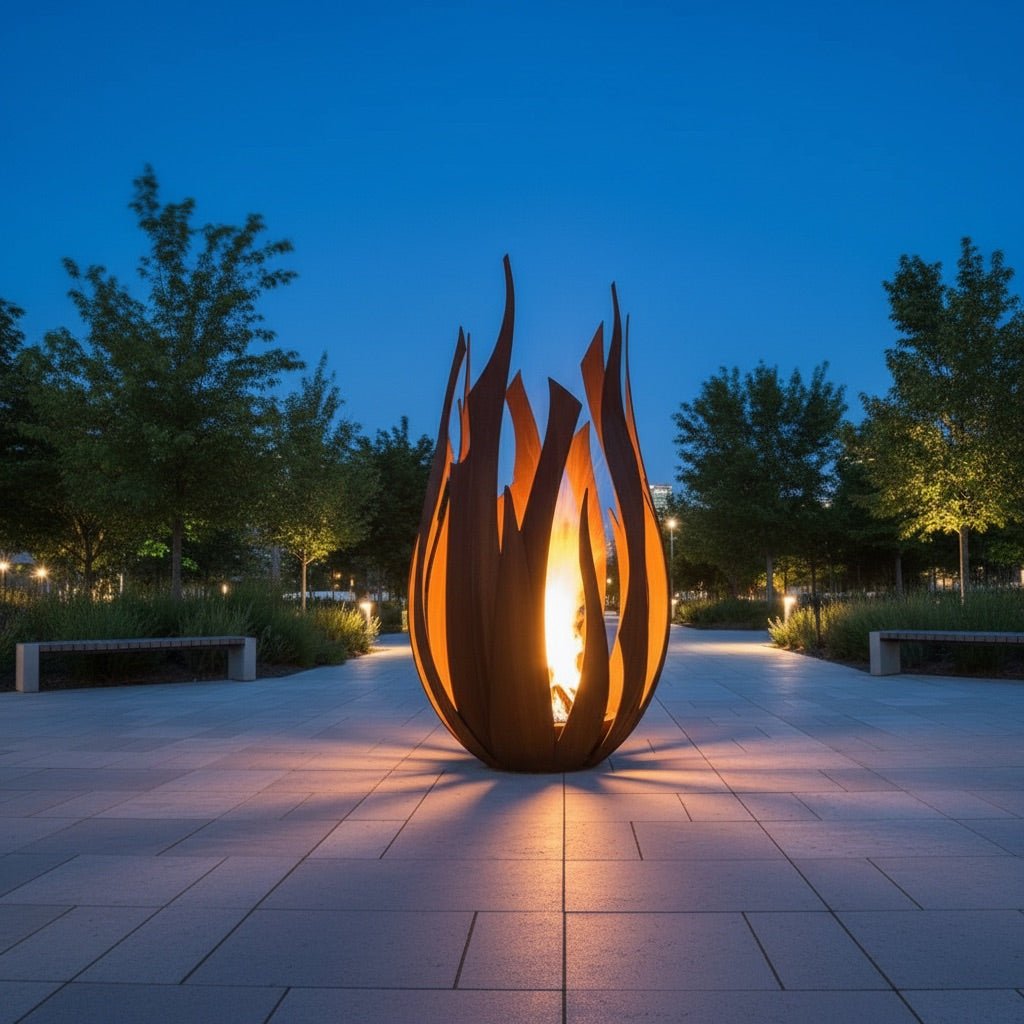 The Comet Crash Metal Fire Sculpture is a bold, celestial-inspired fire feature that mimics the dynamic energy of a falling comet. Its sculptural metal panels twist and rise around the flames, creating an immersive display of light and shadow.