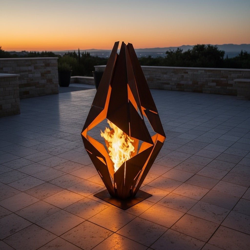 The Ignis Prism Metal Fire Sculpture is a bold fusion of art and fire, designed to be a striking focal point in any outdoor setting. Crafted from premium metal, its faceted geometric design creates dramatic light and shadow effects as flames dance within its sculptural form.