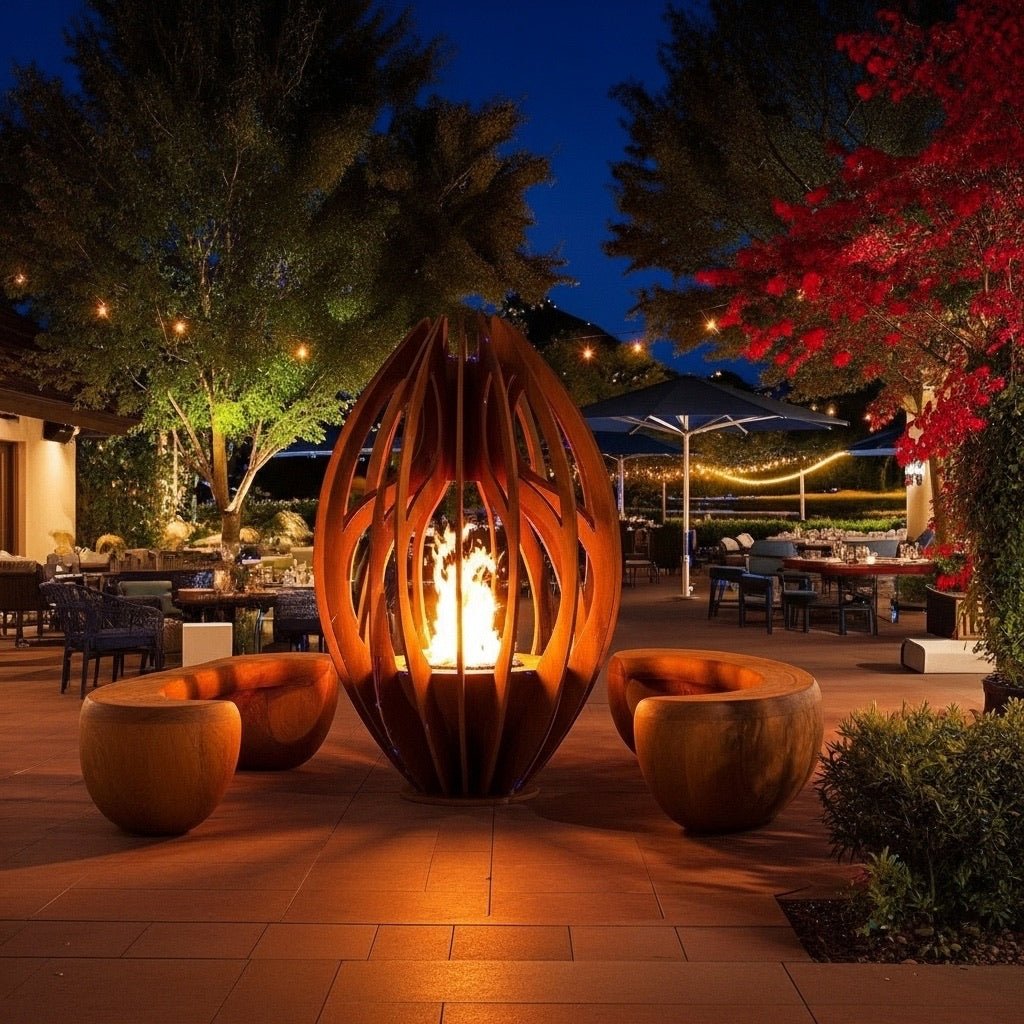 Crafted in marine grade aluminum or Corten steel, the Ovolis is designed for enduring presence in any environment. Its curved silhouette and open latticework reveal the fire within, projecting warmth and shadow in equal measure. Whether placed as a garden centerpiece or a courtyard sculpture, Ovolis elevates its surroundings with quiet power and sculptural elegance.
