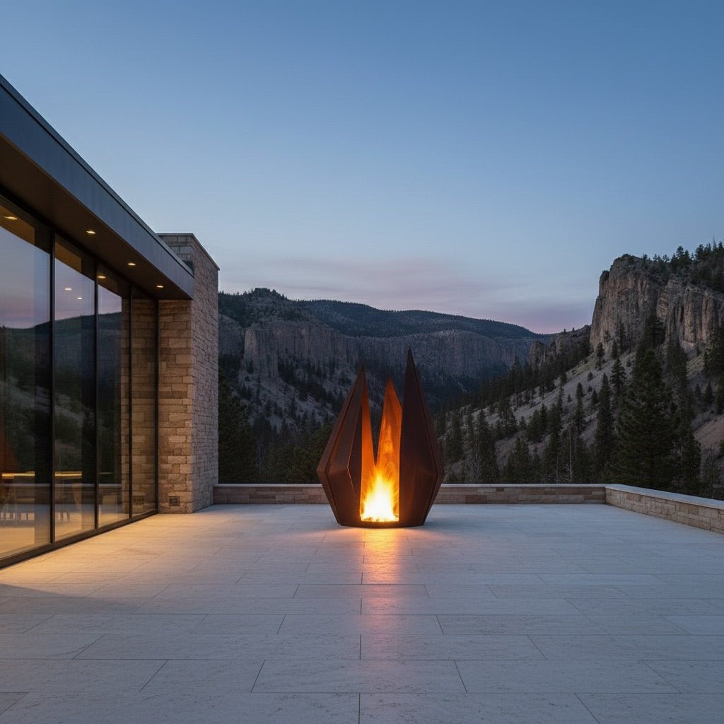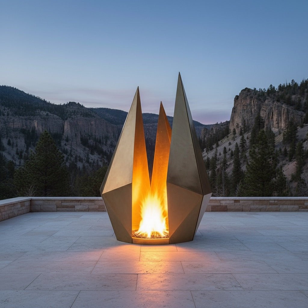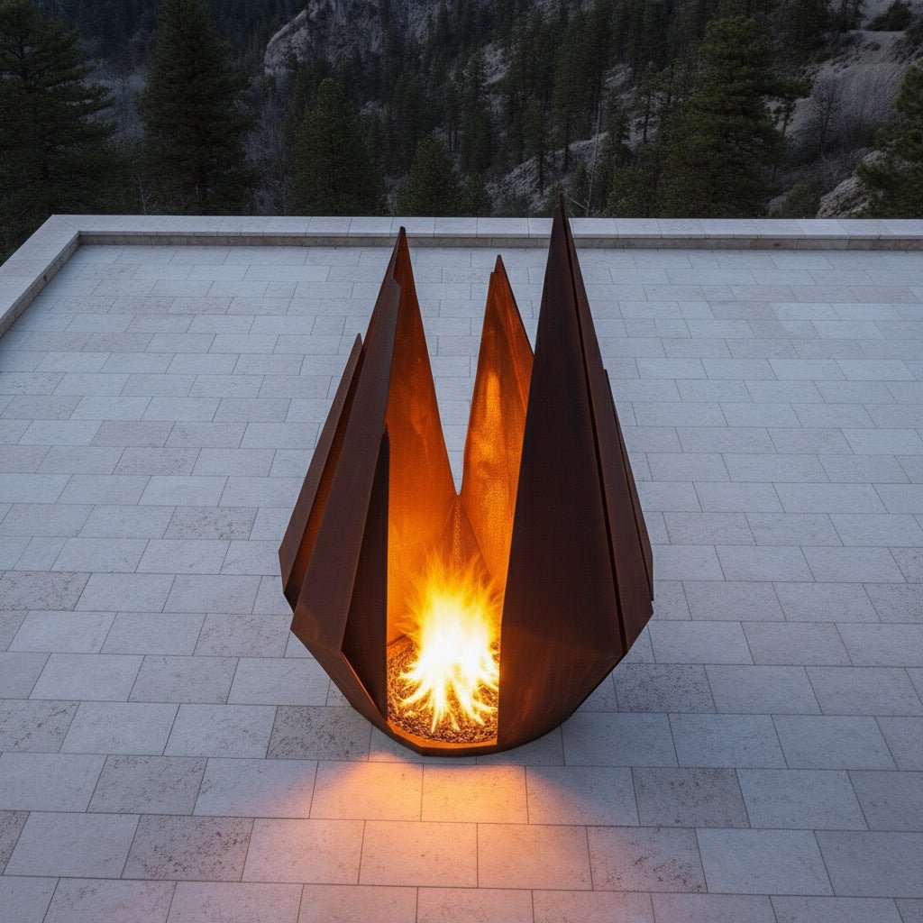 The Spire Kindle Metal Fire Sculpture is a bold, geometric fire feature designed to evoke the towering presence of a blazing spire. Its sharp, angular panels rise dramatically around the flames, creating an architectural statement in any outdoor setting.
