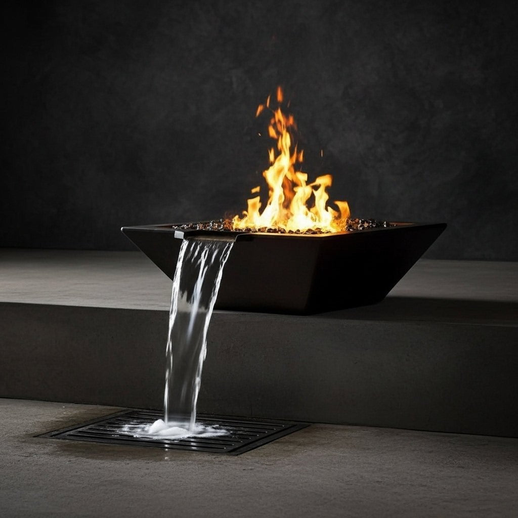 The Geo Square Fire Water Bowl combines modern geometric design with precise angles and functionality, serving as both a fire bowl and water feature. This multi-functional piece enhances any outdoor space, adding a sleek, sophisticated touch to your patio, garden, or backyard. The complex scupper design adds an extra level of elegance, making it a statement piece that will impress any guest.