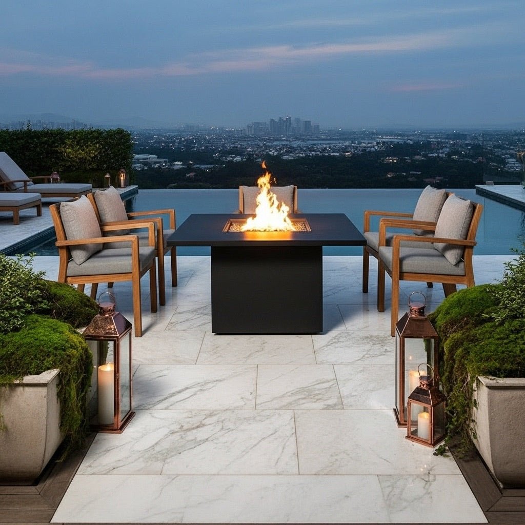 The Quad Fire Pit Dining Table combines a refined square form with a slim tabletop and comfortable dining height, creating a modern centerpiece for any space. Constructed from marine-grade aluminum alloy, it ensures long-lasting durability and clean aesthetics. Suitable for indoor or outdoor use, it brings style, warmth, and functionality to every gathering.